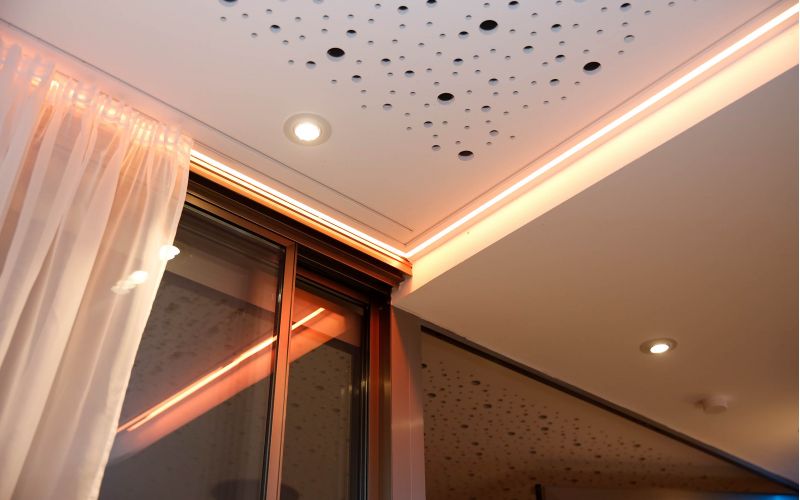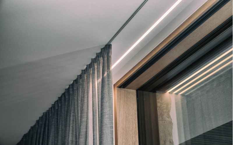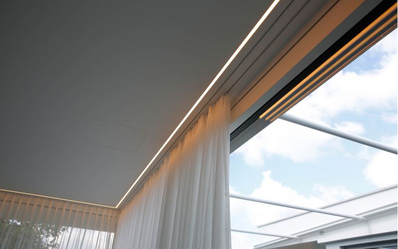 Vorhangschiene und Licht kombiniert durch das Knauf Saga Klips System mit unzähligen Möglichkeiten um Ihre Räume modern und individuell zu Gestalten.